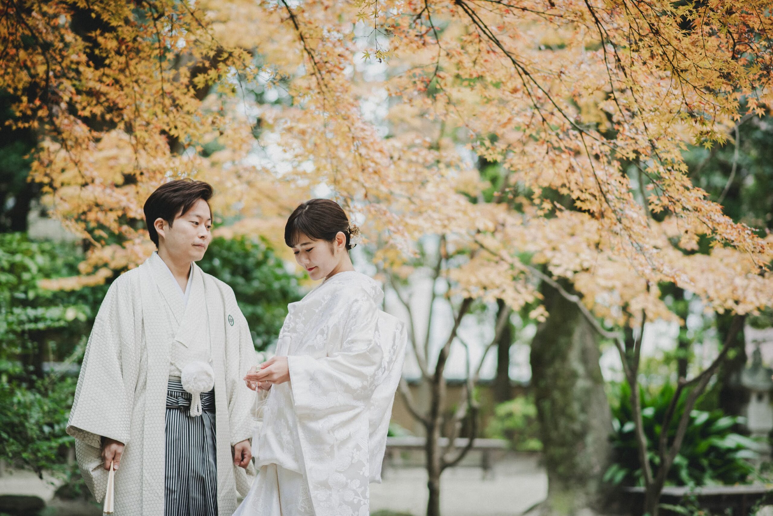 紅葉が色づく境内や、自然を感じられるロケーションで、和装・洋装それぞれの撮影をご案内しております。