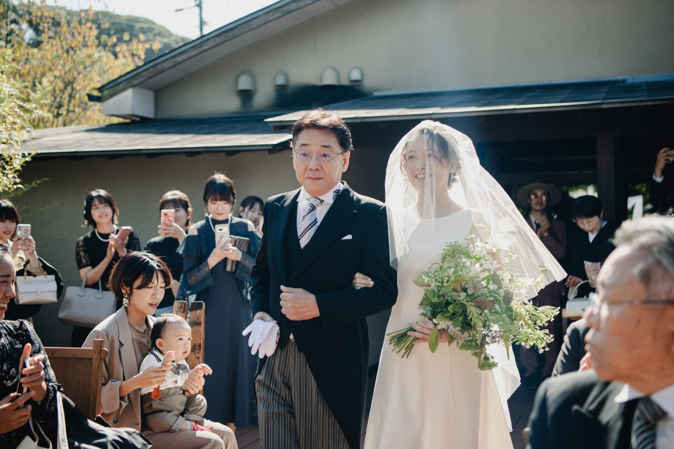 お父様と腕を組んで、新郎様のもとへと一歩一歩大切に進みます