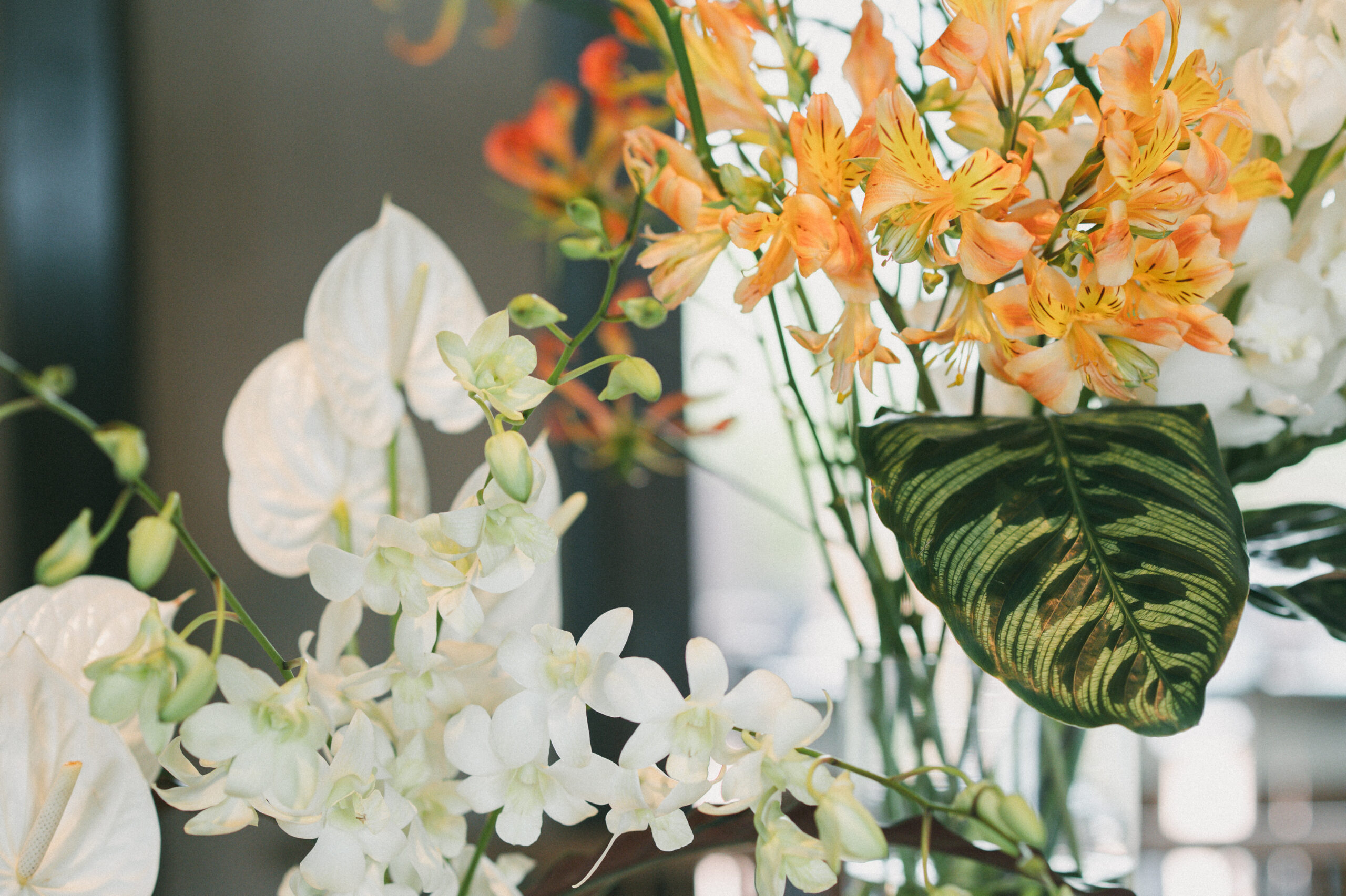 白のデンファレやアンスリュームに 差し色のモカラ