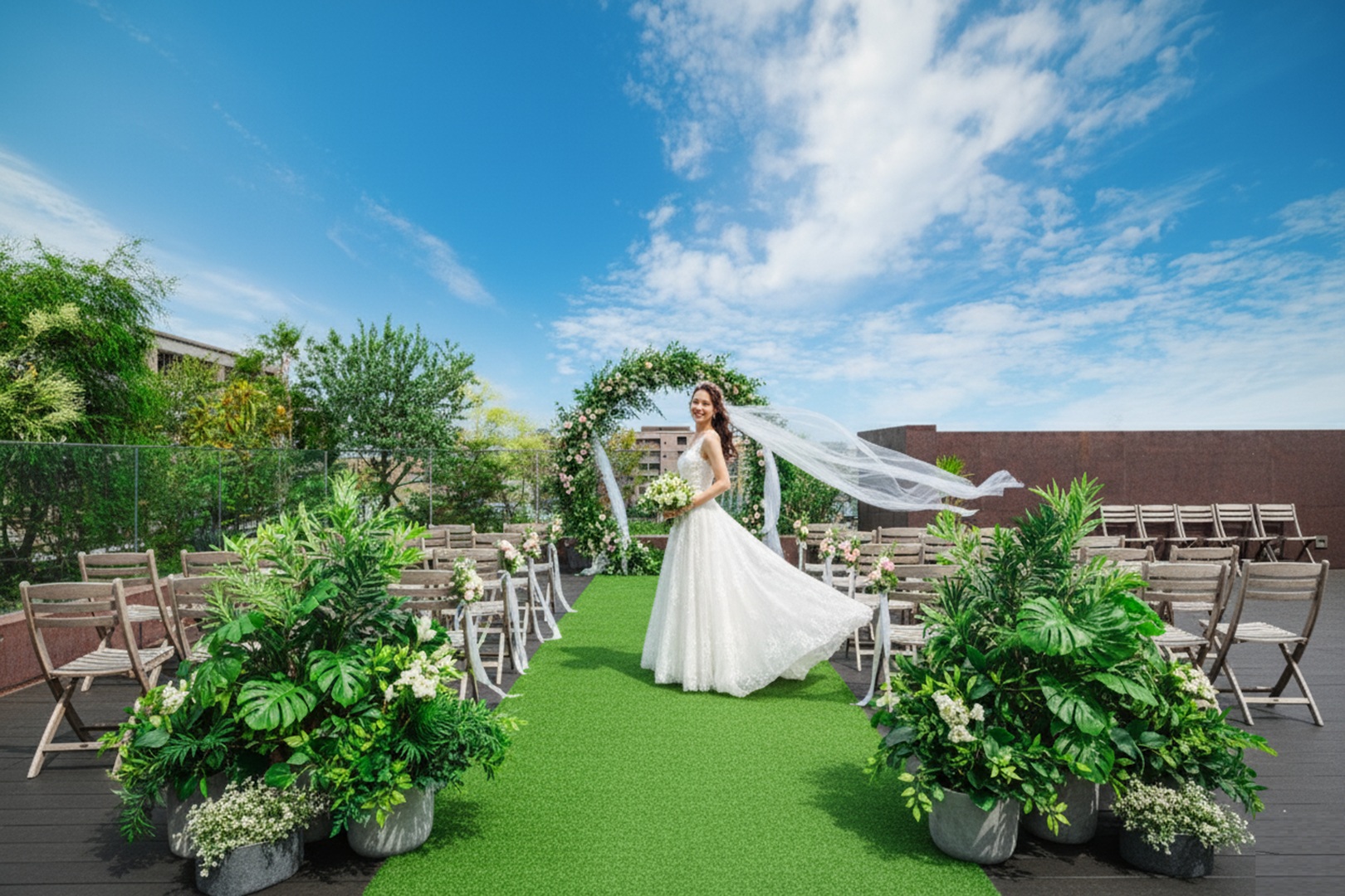 緑に囲まれたルーフトップテラスで執り行う人前式は明るく開放的