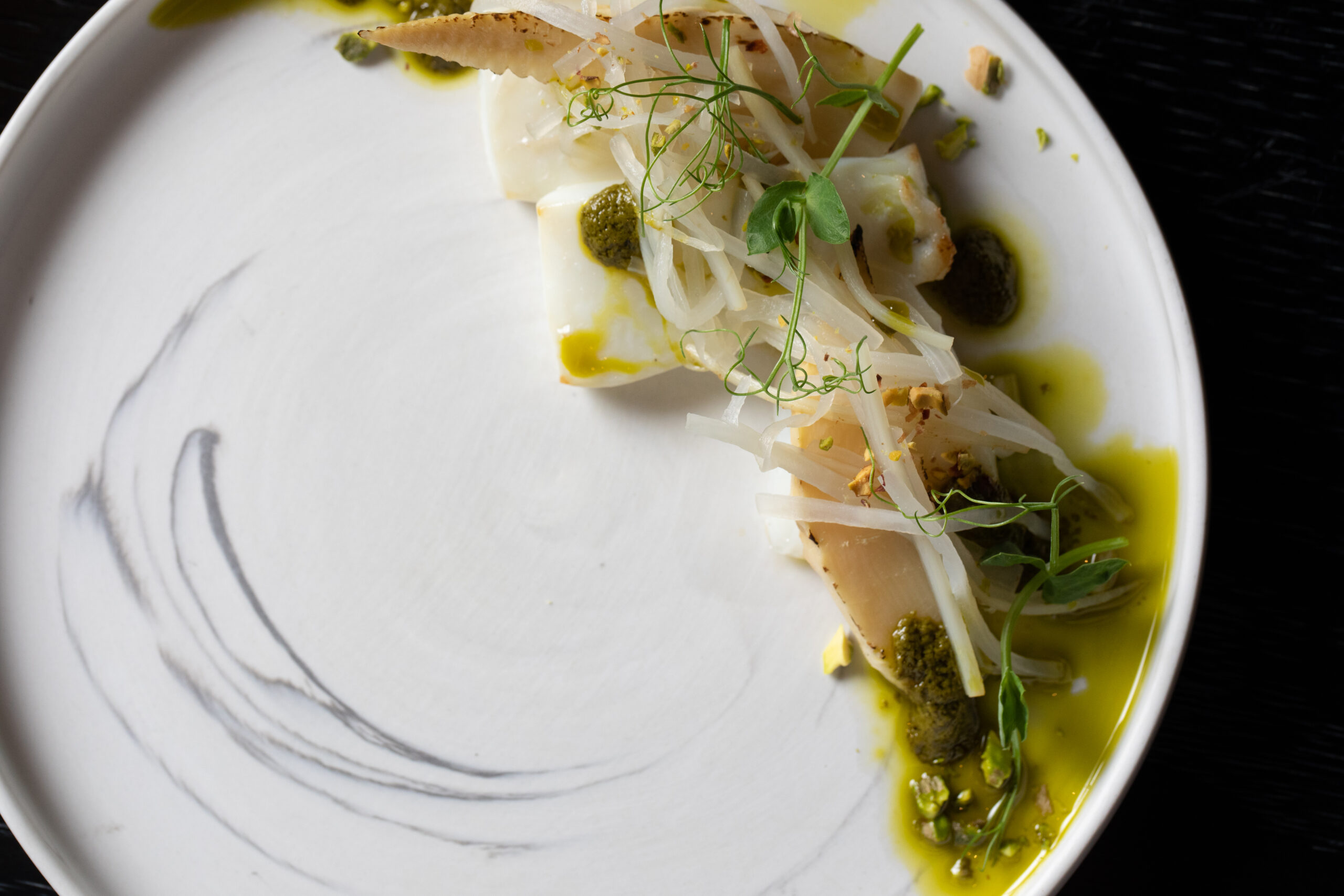 お店のオープン当初から変わらず守り続けている特別な料理。器の中には苔や石、瑞々しい緑が丁寧にあしらわれ、Watahanの庭園をイメージ。季節ごとに表情が変わり、春はそら豆を使用。口に含めば、そら豆の青い香りがふわりと広がり、思わず笑みがこぼれます。