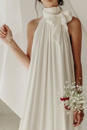 首元はハイネックで、特に目を引くのはボリュームのあるボウタイの装飾。このディテールが、ドレス全体に洗練されたロマンチックな印象を与えています。ホルターネックのデザインで、ボディラインを拾わない、ゆったりとしたリラックス感のあるストレートなシルエット。