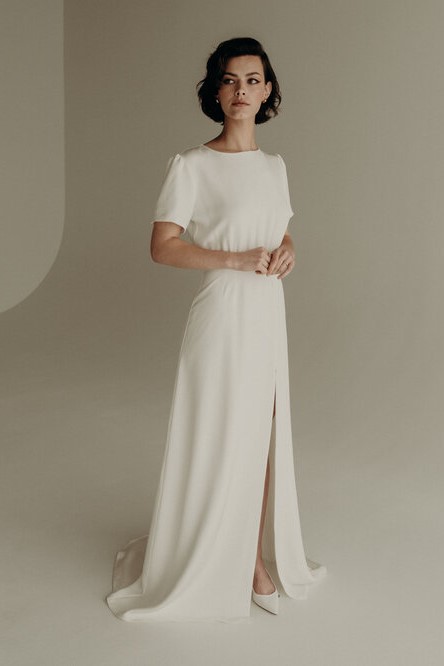 このドレスの最も特徴的な部分は後ろ姿です。背中の上部が開き、複数のリボンが縦に並んであしらわれています。このリボンがクラシックなデザインに可愛らしさと個性的なアクセントを加えています。クラシックで控えめながらも細部にこだわりたい花嫁さま向けです。