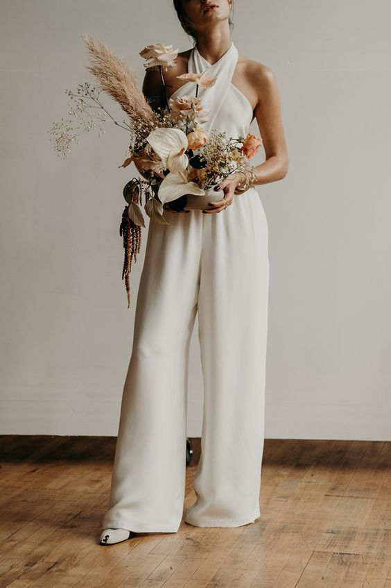 ドレープ性の高い滑らかな素材、エレガントな雰囲気非常に幅の広いワイドレッグパンツになっており、ドレスのようなボリューム感と流れるようなシルエットを生み出しています。ドレスの優雅さとパンツのモダンなシャープさを兼ね備えた、コンテンポラリーでスタイリッシュなパンツスタイルドレスです。